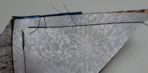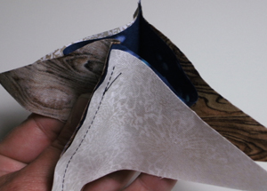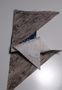 Fold the thread fabric in half , right sides out, with the fold to the right and sandwich between a wood triangle and a white triangle, right sides in, lining up the four raw edge corners. The fold of the square should be towards the center of the seam and you should stitch across it. Stitch the seam leaving the first 1/4″ open. I backstitch at the beginning of the seam. Flip the piece around and sew triangles on the other end in the same order and manner.