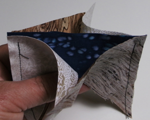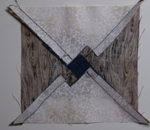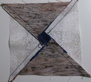 Open the center square and pull the seam allowances together. Line up the triangles to the right of the seam allowances and sew in the same manner as the previous two seams. Turn the piece around and sew the final seam.