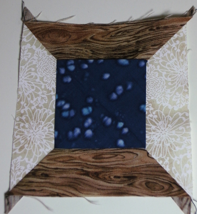 From fabric that looks like wood and white on white fabric cut strips 2 3/4″ each. From the strip make 45″ cuts to get half square triangles with the straight on grain on the long side. Use the 45 degree line on the ruler. You end up flipping the ruler back and forth. A spinning mat helps.