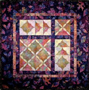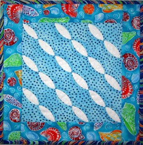 This was a fun Twilt to make. It uses 3D squares and 3D diamonds. The diamonds require a template but the rest of the piece uses squares and rectangles. I finished, “Storm at Sea”, using the grid and scallop quilting variation.