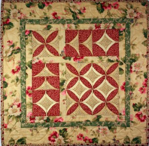 I have been working a few shows lately and sold a few of my pattern, “Cathedral Window Sampler”. It’s available for $9.25 plus $1.25 postage in the US. Email me if you’re interested in purchasing one. Click on the pictures to see high res versions of the Sampler and the Tradition variation on Flickr. I promised I would post some info on how to finish the Sampler so that it looks Traditional. It won’t make much sense if you haven’t bought the pattern but for those who have, here goes:
