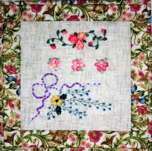 Last Saturday I taught my first silk ribbon embroidery class in at least 15 years. It felt good. I needed a sample to work from for the class so I put this together. Why not let it double as a Twilt.