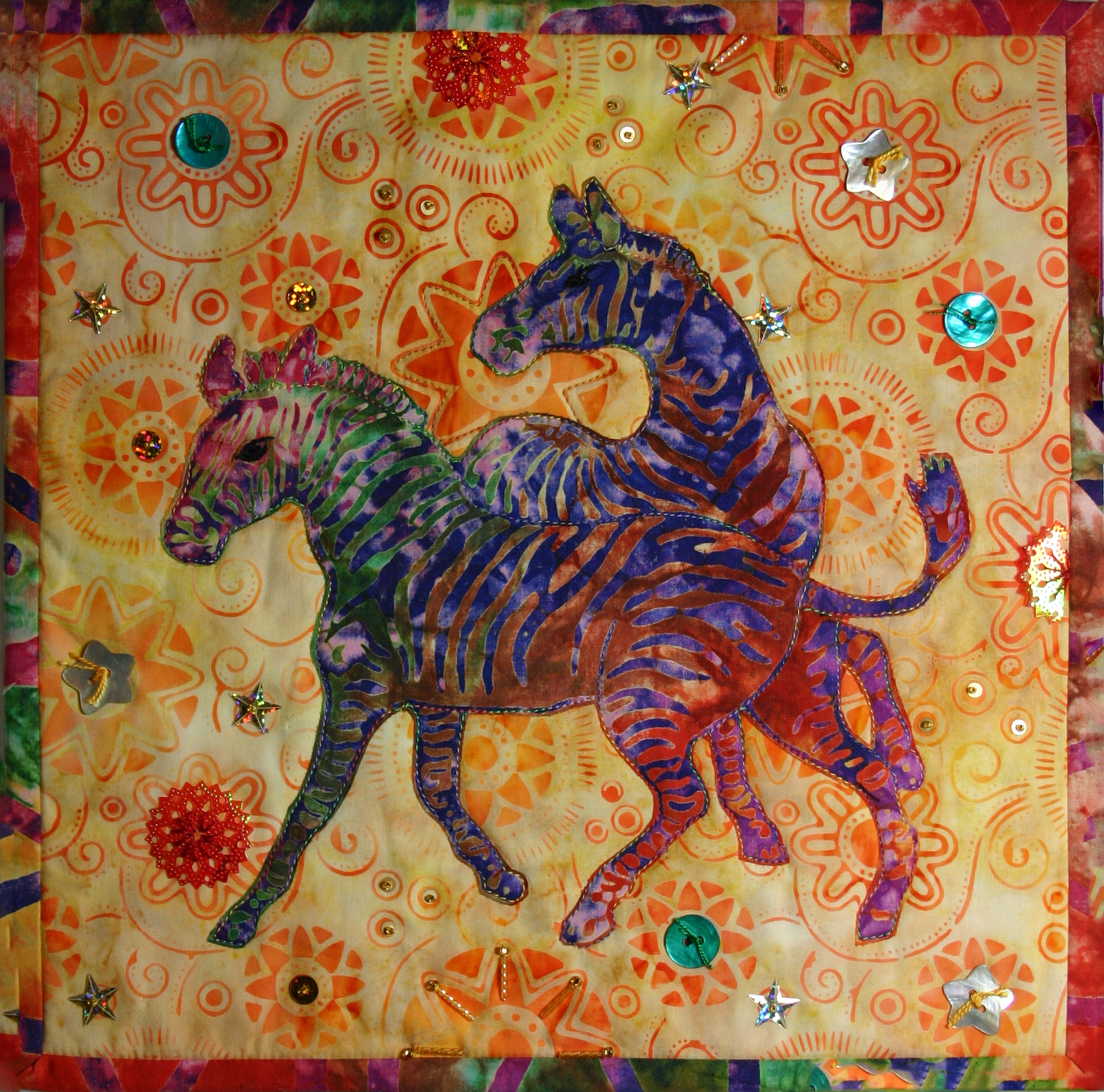For February we were challenged with Colorful and then Animal. I knew immediately that I would use the Zebra Batik from the 80’s. I applied fusible web to the batik print ,cut out the Zebras and stitched them in place. Once I fused them to the background batik I added a variety of sequins and buttons. It’s called “Dance of the Zebras”