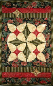 This was a fun Twilt to make. It uses 3D squares and 3D diamonds. The diamonds require a template but the rest of the piece uses squares and rectangles. I finished, “Storm at Sea”, using the grid and scallop quilting variation.
