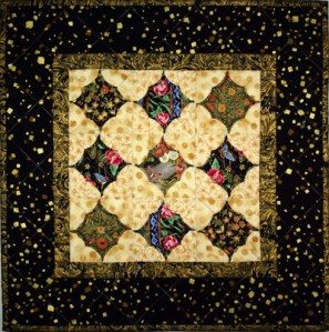 I am welcoming October this first Twilt Tuesday with “October Sky”. This Twilt features nine miniature Star Puzzle blocks in blue and purple batiks complimented by an Asian print border. Each block is a three-dimensional square like the knot of a 3D Bow Tie block. The edges of the square are bias so after stitching diagonally through all the squares I rolled and stitched the folds into curves.